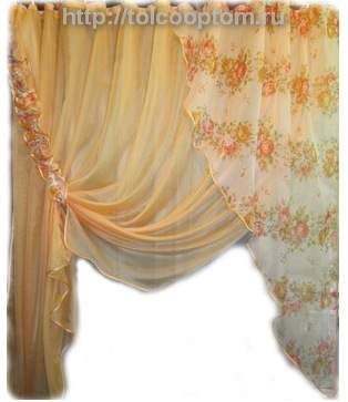Ткань: вуаль + вуаль-печать. Одна половина из однотонной вуали подбирается в тон к вуали-печать. Например, если вуаль-печать с голубыми цветами, то другая часть из гладкой вуали будет голубая или белая.